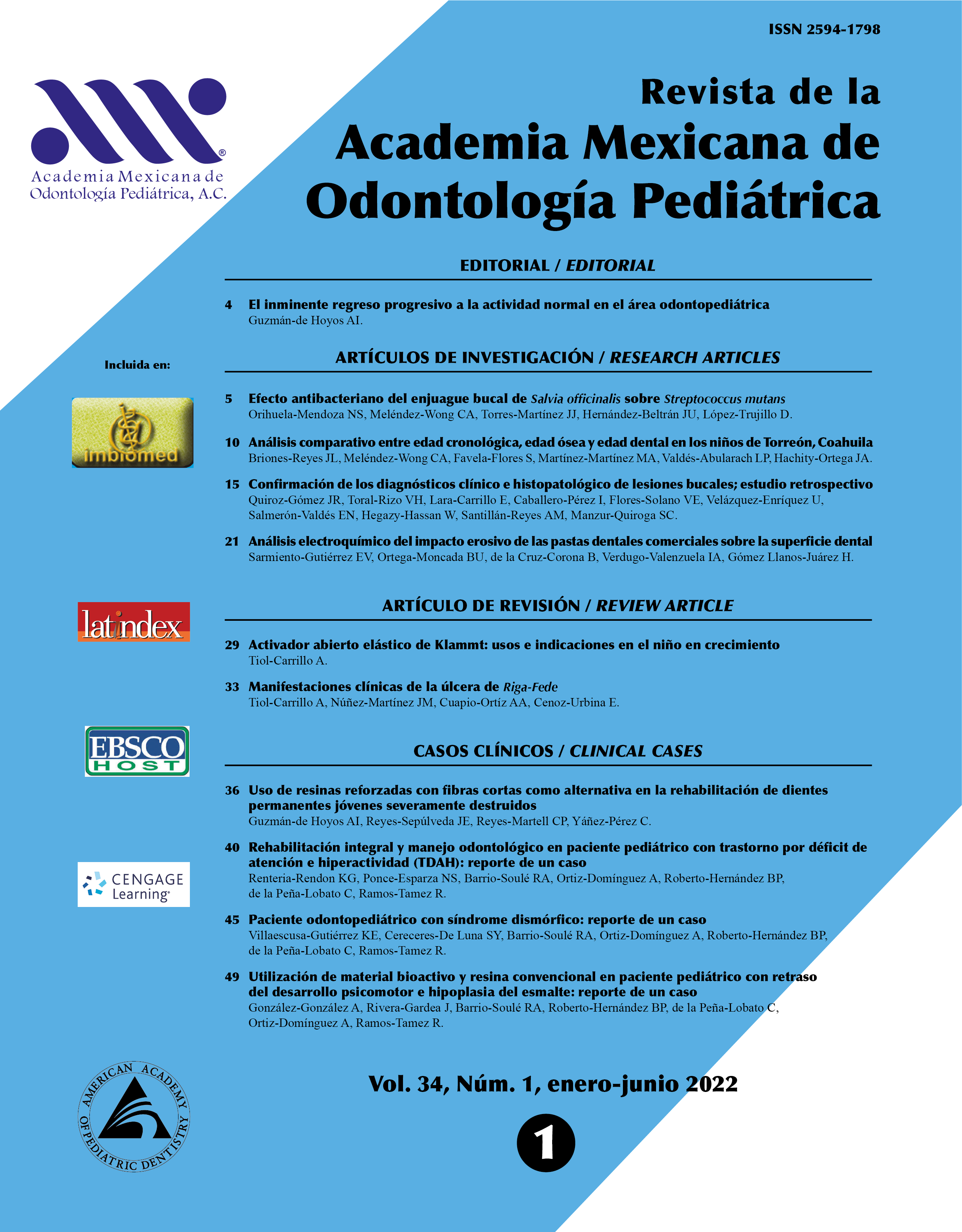 Revista de la Academia Mexicana de Odontología Pediátrica Año 34, Vol. 34, Núm. 1, enero-junio 2022, es una publicación semestral, editada y órgano oficial de comunicación científica de la Academia Mexicana de Odontología Pediátrica, A.C., calle Baja California # 210, Desp. 503, Colonia Roma Sur, Alcaldía Cuauhtémoc. Ciudad de México, C.P. 06760, Tel. (55) 5264-6858, https://www.amop.org.mx, amop@live.com.mx, informes@amop.org.mx, Editor responsable: Mtro. Enrique E. Huitzil Muñoz, iconomania@gmail.com Reserva de Derechos al Uso Exclusivo, género publicaciones periódicas 04-2107-120619451300-203, ISSNe 2683-3123, ambos otorgados por el Instituto Nacional de Derecho de Autor.