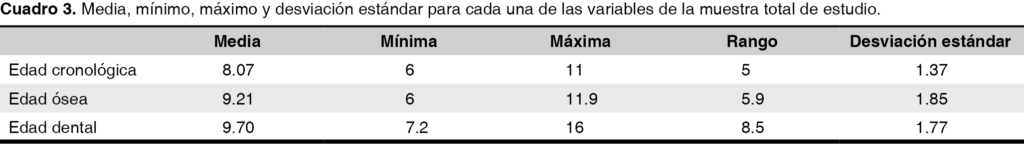Los resultados conseguidos en la presente investigación no coinciden con los obtenidos en el estudio realizado por Arciniega, Ballesteros y Meléndez3 en la Universidad Nacional Autónoma de México, quienes hallaron diferencias estadísticamente significativas entre las tres variables. No hubo correlación entre la ED y la esqueletal al igual que para la EC y la edad esqueletal. En la ED y la EC se encontró muy poca correlación. Esta diferencia puede deberse a que la población de este estudio abarcó niños de seis a 11 años; en tanto que en Arciniega y cols. fue de ocho a 14 años; varios autores coinciden que a la edad de 13 años hay una variación considerable en los picos de crecimiento y maduración.