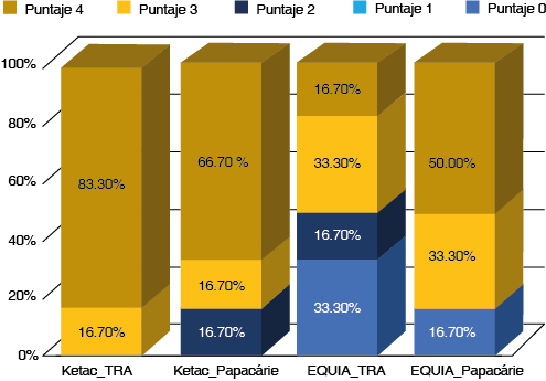 Los porcentajes de las puntuaciones de microfiltración por grupo de estudio se muestran en la figura 1. La distribución de frecuencias no presentó diferencias estadísticamente significativas (Chi cuadrado de Pearson, p = 0.435), pese a que los dientes restaurados con Ketac Molar Easymix® (grupos 1 y 2), en comparación con los dientes restaurados con EQUIA Forte (grupos 3 y 4), presentaron mayor frecuencia de microfiltración (100 vs 75%) y profundidad de penetración del tinte (puntaje 4; 75 vs 33.30%) (Chi cuadrado de Pearson, p = 0.133). Imágenes representativas de las muestras se presentan en las figuras 2 y 3. La puntuación 0 solo se observó en dientes restaurados con EQUIA Forte Fil y EQUIA Forte Coat. Por el contrario, el puntaje 4 se presentó en la mayoría de las muestras restauradas con Ketac Molar Easymix®.