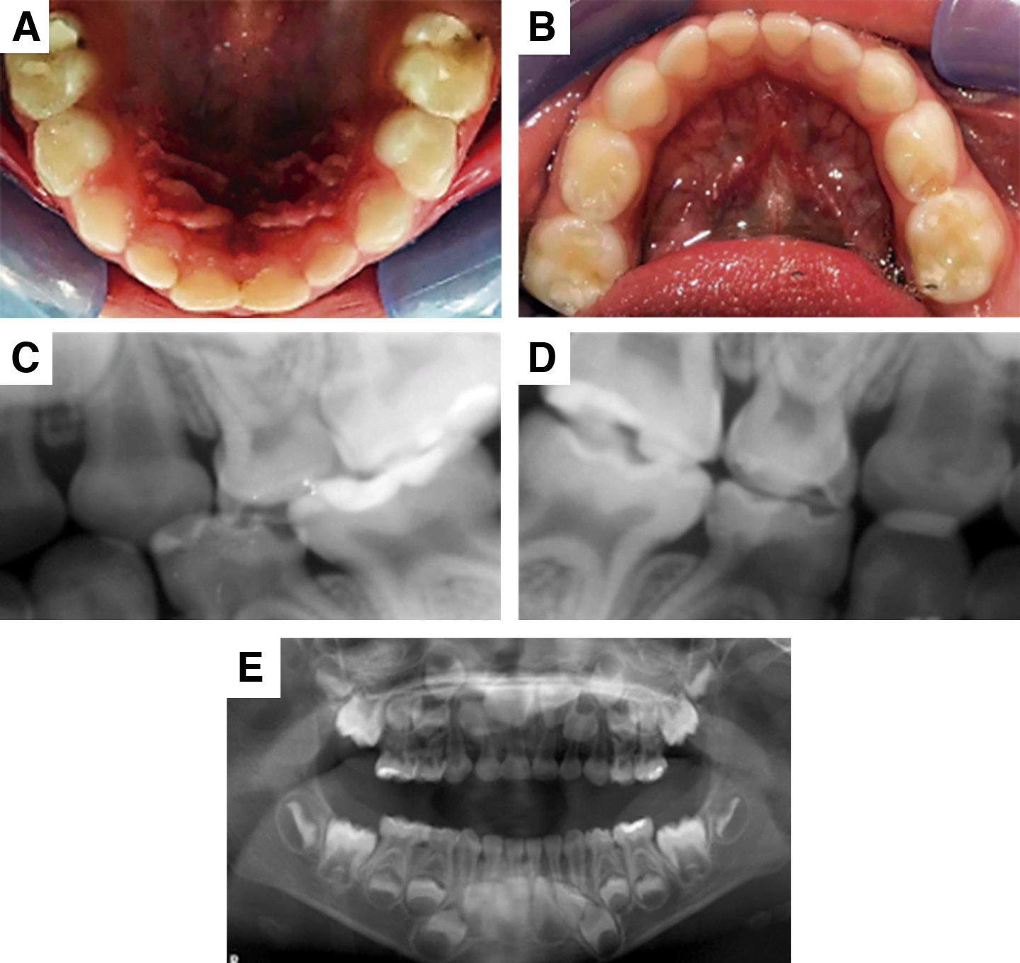 El tratamiento odontológico inicial consistió en la toma de radiografías de aleta de mordida de los cuatro cuadrantes (figura 1C y D), además de una radiografía panorámica (figura 1E). Se realizó interconsulta con el cardiólogo pediatra explicando el diagnóstico obtenido de la revisión clínica intraoral y examen radiográfico, con el fin de discutir el uso de medicamentos anticoagulantes que se estaban utilizando, lo que podría ocasionar problemas relacionados con la hemostasia. Se discutieron los riesgos del paciente de presentar EI, así como la manera de prevenirla.