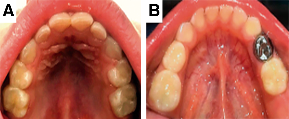 En las citas subsecuentes se llevó a cabo profilaxis y aplicación de flúor, procedimientos restaurativos, tales como resinas y selladores en las siguientes piezas: canino superior derecho, segundo molar superior derecho, segundo molar superior izquierdo, segundo molar inferior izquierdo, primer molar inferior derecho, segundo molar inferior derecho; además de efectuar una pulpotomía y corona de acero en el primer molar inferior izquierdo (figura 2A y B) bajo anestesia local y con aislamiento absoluto, de acuerdo con las indicaciones de las guías de la Academia Americana de Odontología Pediátrica (AAPD, por sus siglas en inglés).8 Por indicación de su cardiólogo pediatra, se administraron 50 mg/kg de amoxicilina por vía oral previo a cualquier procedimiento invasivo, como profilaxis antibiótica.