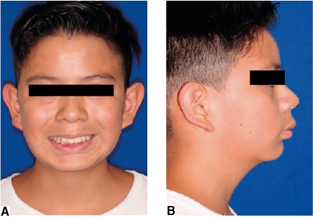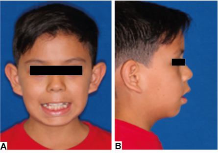 Figura 1. Fotografías extraorales del paciente. A) Frente con sonrisa y B) perfil, en la que se advierte una incompatibilidad labial y ligera protrusión bimaxilar.