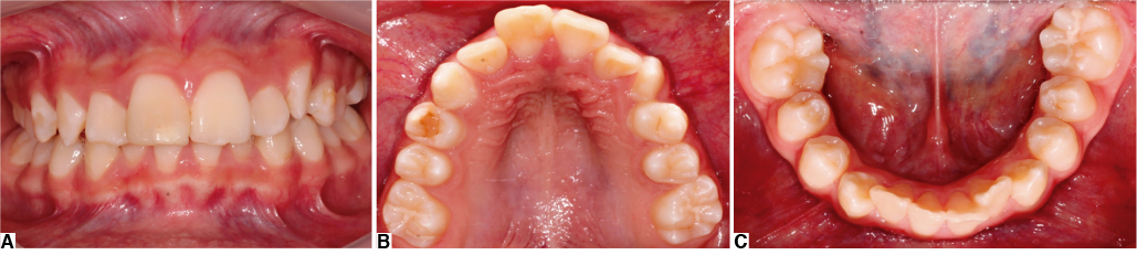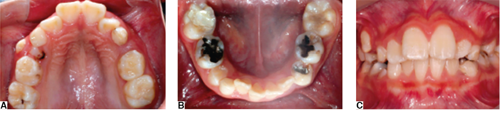 Figura 2. Fotografías intraorales. A) Oclusal maxilar con discrepancia dentoalveolar. B) Oclusal mandibular (discrepancia de 15 mm). C) Frente con línea media coincidente, SMV 5% y ligera protrusión dental.