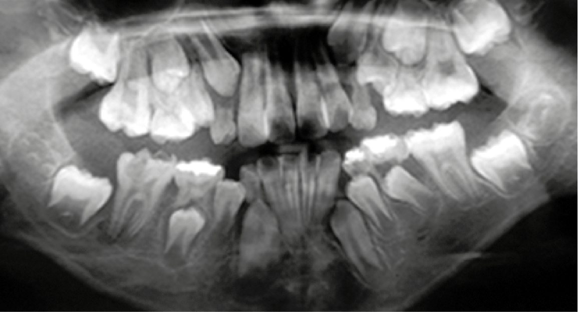 Figura 3. Radiografía panorámica al inicio del tratamiento que evidencia la destrucción de los primeros molares permanentes y la gran discrepancia dentoalveolar de los maxilares.
