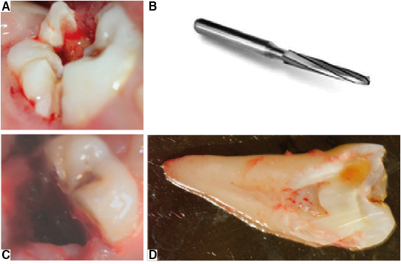 Figura 4. A) Técnica de hemisección del primer molar permanente realizada con B) fresa quirúrgica de 23 mm Carburo de Tungsteno de alta velocidad. C) Eliminación del fragmento radicular mesial. D) Resto radicular.