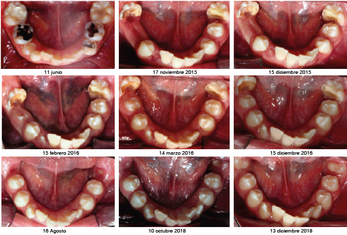Figura 6. Fotografías intraorales del aro mandibular de la técnica de desgaste selectivo y extracción de primeros molares permanentes con HMI severa. Iniciales (11-VI-2015) y finales antes del inicio de la ortodoncia (13-XII-2018).