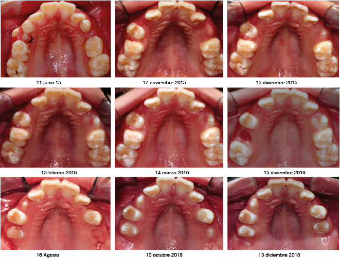 Figura 7. Fotografías intraorales del aro maxilar con la extracción de primeros molares permanentes con HMI severa. Iniciales (11-VI-2015) y finales antes del inicio de la ortodoncia (13-XII-2018).