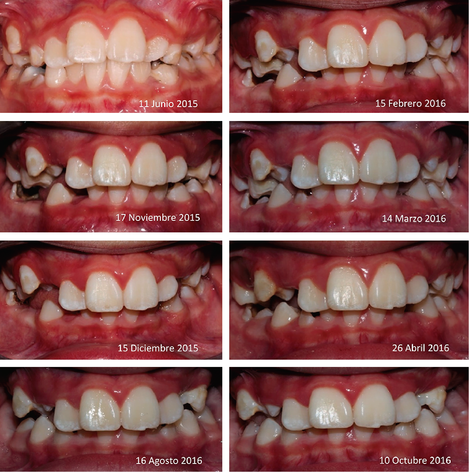 Figura 8. Fotografías intraorales de frente, en las que observa que se mantiene la línea media y se aumenta la sobremordida vertical ante la técnica de desgaste selectivo y extracción de primeros molares permanentes con HMI severa. Iniciales (11-VI-2015) y antes de la exodoncia de los primeros molares superiores (13-X-2016).