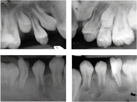 Figura 9. Radiografías periapicales superiores e inferiores en las que se evidencia el deslizamiento distal de caninos y premolares inferiores después de la eliminación de los fragmentos mesiales. Además, liberación de espacios en el arco superior después de la exodoncia de los primeros molares permanentes con HMI severa.