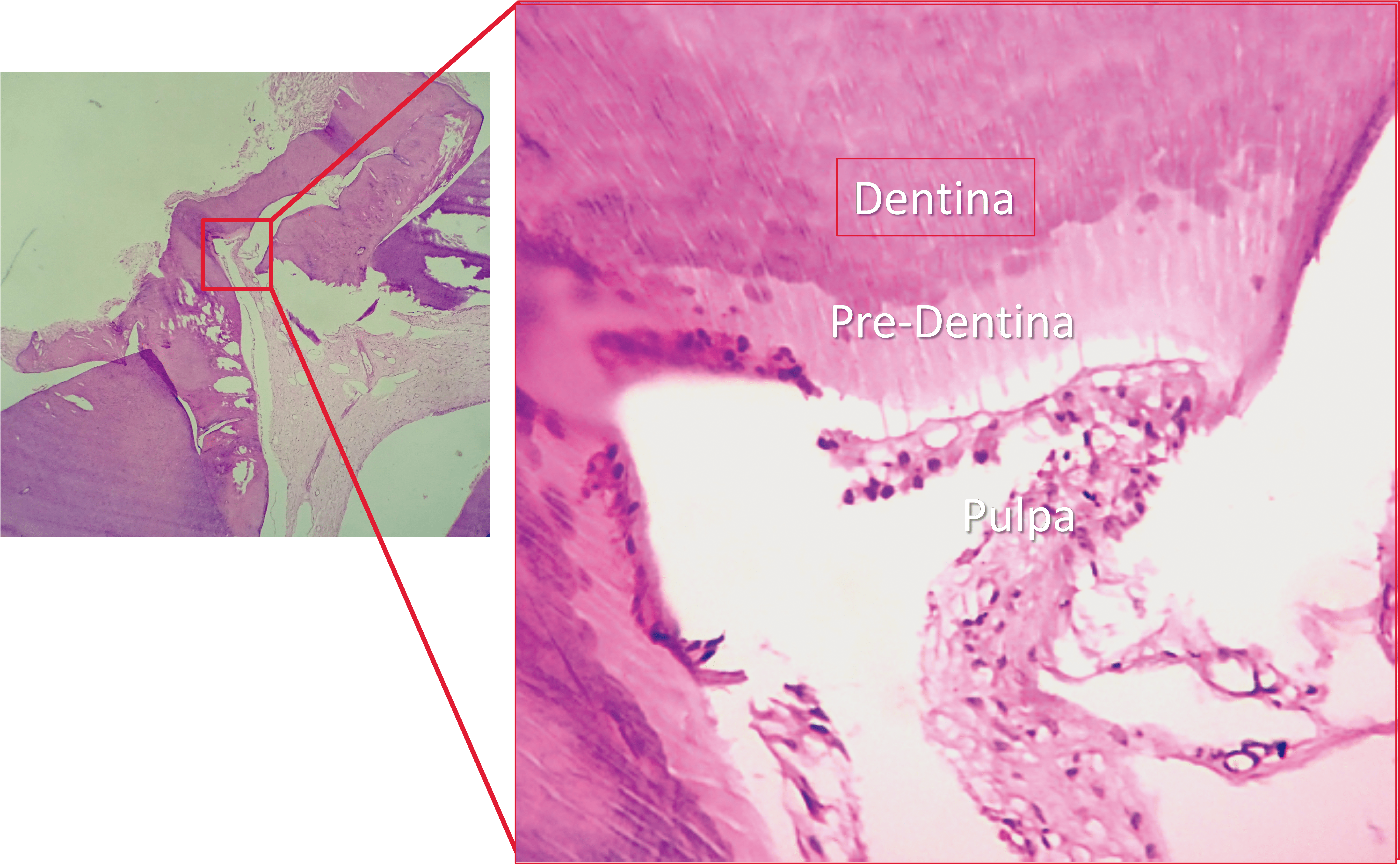Figura 10. Fotografías de microscopio óptico del resto radicular distal, la zona del corte en la parte superior izquierda muestra un área mineralizada; en la imagen amplificada se aprecia en la parte superior, dentina sana seguida de predentina y una pulpa con un lecho odontoblástico sano (se nota un desprendimiento del lecho odontoblástico como defecto en la técnica de la preparación de la muestra).