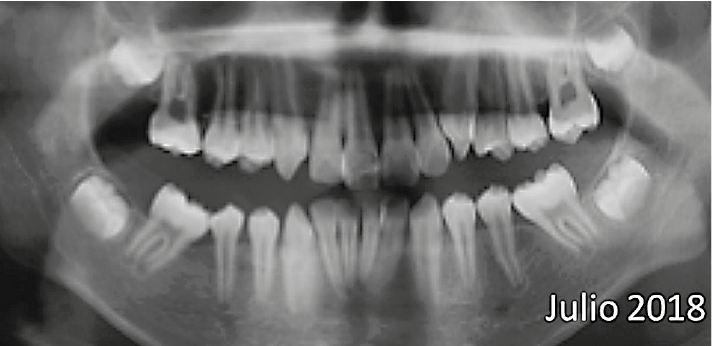 Figura 13. Radiografía panorámica al inicio del tratamiento ortodóntico donde se advierte el movimiento de mesialización de los segundos molares que han logrado contactar la parte distal del segundo premolar.