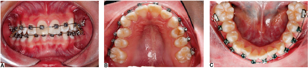 Figura 12. Fotografías de A) Intraoral de frente al finalizar la secuencia de desgastes controlados con extracciones. B) Oclusal maxilar. C) Oclusal del arco mandibular. Se nota el remplazo del primer molar con HMI por el segundo molar, dejando la finalización del tratamiento para el ortodoncista.