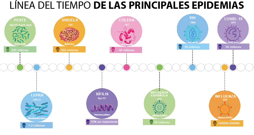 Existen muchas enfermedades históricas catalogadas como “peste”, como la peste de Atenas, la peste de Orosius, Antonius o Cipriano. Aunque sin duda fueron letales, ahora se considera que fueron brotes de otras infecciones. El primer brote de peste, cuyas descripciones concuerdan con los signos y síntomas característicos, fue en el siglo VI (peste de Justiniano). Constantinopla fue una de las ciudades más afectadas, con cifras de hasta 10 000 muertos al día.5 Durante los siguientes años hasta un cuarto de la población del Mediterráneo pereció a manos de la peste. El temor a la enfermedad paralizaba a la población y, en consecuencia, todas las actividades económicas se detenían. La peste no respetaba a nadie, sus víctimas eran pobres y ricos, nobles y campesinos. El segundo ciclo de peste —la catastrófica muerte negra— se extendió por Asia, el Este, África y Europa, a mediados del siglo XIV. En unos cuantos años, de 1347-1353, murieron por lo menos 25 millones de personas, lo que corresponde a un tercio de la población de la época.2,5