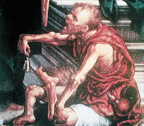Figura 3. Detalle de la pintura El Juicio Final de Bernard Van Orley, que muestra a un hombre con lepra en estadio avanzado con lesiones nodulares deformantes sosteniendo una campana con su mano derecha.