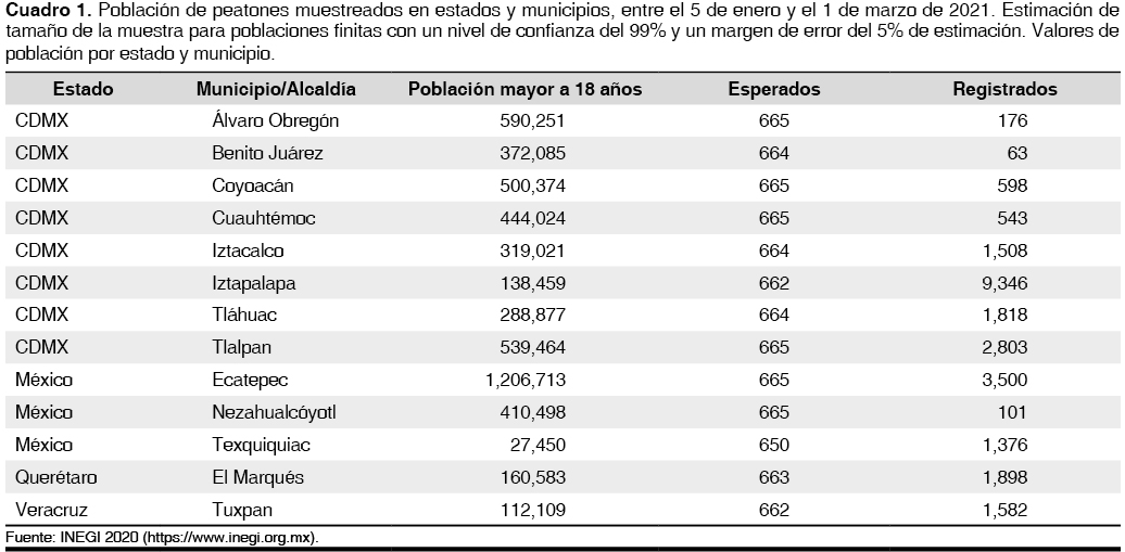 A partir del total de registros (n = 25,302), se estimó el tamaño de la muestra ponderada para poblaciones finitas con un margen de error máximo del 3%, un nivel de confianza del 99% y una probabilidad de ocurrencia de 0.5 (esperado n = 1,723). Los registros obtenidos fueron más altos de lo esperado en tres de los estados, a excepción de Veracruz (figura 1). Del mismo modo, se estimó el tamaño de la muestra para cada uno de los 13 puntos de registro municipales con intervalo de confianza del 99% y un margen de error del 5%, y se obtuvo un esperado para cada sitio de entre 650 a 665 individuos. Los registros para la CDMX tiene dos registros con valores por debajo de lo esperado y dos cercanos a lo referido, y cinco puntos con registros de entre 1,508 a 9,346 individuos. En uno de los estados (Estado de México) solamente hubo un punto con bajo registro, y en Querétaro y Veracruz el muestro fue superior a 1,500 personas (cuadro 1).