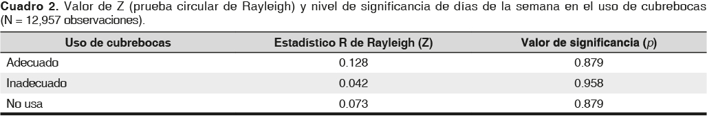 Para describir la variación en el uso de cubrebocas por día de la semana, se analizaron datos de los registros de todos los días, del 16 de febrero al 1 de marzo, con un análisis circular con Oriana (4.02) en donde se utilizó la prueba R de Rayleigh para contrastar el uso de cubrebocas entre fechas. Para el caso de la comparación de proporciones por género se hizo un análisis de bondad de ajuste, en donde la estimación esperada fue la proporción por género ponderada por los datos de proporción por género en los registros del INEGI (https://www.inegi.org.mx/temas/estructura/). También se diseñaron tablas de contingencia para demostrar la independencia entre los factores género, uso y color de semáforo epidemiológico, así como el análisis de residuales de Pearson y razón de momios (odd ratios) para comparar riesgos. Todos los análisis no circulares se efectuaron en R 4.0320 con los paquetes “vcd”21 y “epitools”.22