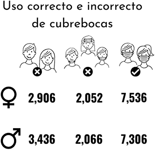 Figura 2. Número de individuos por género (mujeres y hombres), muestreados entre el 5 de enero y 1 de marzo de 2021, en la vía pública que no usaban, usaban incorrectamente, o usaban correctamente el cubrebocas.