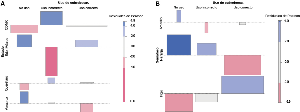 Figura 3. Análisis de residuales de Pearson a partir de la tabla de contingencia probando: A) el uso de cubrebocas y el estado de la República muestreada y B) el estado del semáforo epidemiológico y el uso de cubrebocas en peatones (n = 25,302 peatones) de cuatro estados de la República Mexicana durante la pandemia por SARS-CoV-2. La escala de color indica que azul es más y rojo menos de los esperados por azar. El tamaño de las barras delimita la frecuencia de observación.