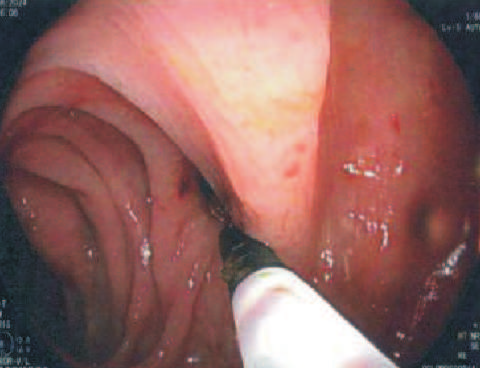 De los ocho pacientes analizados, 7 correspondieron al sexo masculino y uno al sexo femenino, el rango de edad de los pacientes fue de los 48 a 75 años, con una media de 63.37 y una mediana de 65. Tres pacientes tenían diagnóstico de enfermedad diverticular asintomática y un paciente había presentado un cuadro previo de hemorragia del tubo digestivo por enfermedad diverticular del colon. Todos los pacientes presentaron hemorragia severa del tubo digestivo distal. Cuatro pacientes tuvieron dolor abdominal moderado en cuadrante inferior izquierdo del abdomen (50%), uno en ambos cuadrantes inferiores y uno en cuadrante inferior derecho, en tanto que dos pacientes no presentaron dolor abdominal. En todos los casos se indicó colonoscopia de urgencia dentro de las primeras 24 horas de inicio del padecimiento, en 5 paciente se identificó el divertículo sangrante en el colon izquierdo (60%) y en tres en el colon derecho (30%). En todos los casos se inyectó epinefrina diluida (1:10,000) en la submucosa realizando cuatro inyecciones en los cuadrantes circundantes al sitio sangrante (Figura 1). En seis de los pacientes se logró el control de la hemorragia, dos pacientes sangraron nuevamente (25%); a uno de ellos se le realizó nuevamente colonoscopia y aplicación de epinefrina diluida (1:10,000), en tanto que al otro se le aplicó un hemoclip, consiguiéndose el control de la hemorragia en estos dos casos también; ningún paciente ameritó cirugía de urgencia.